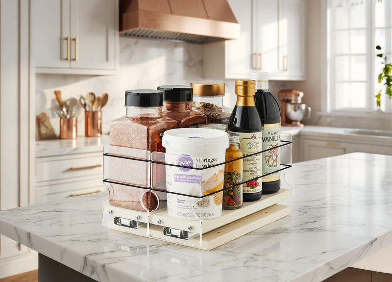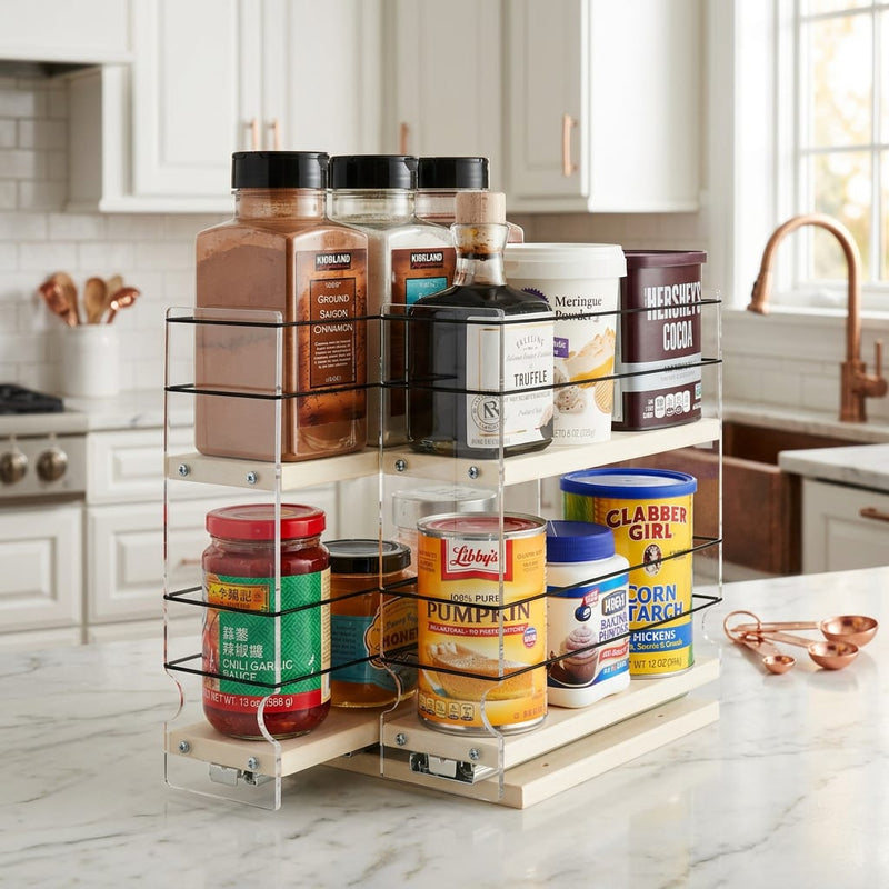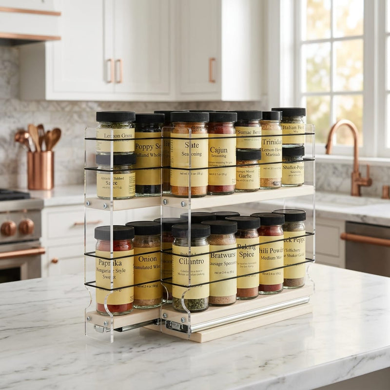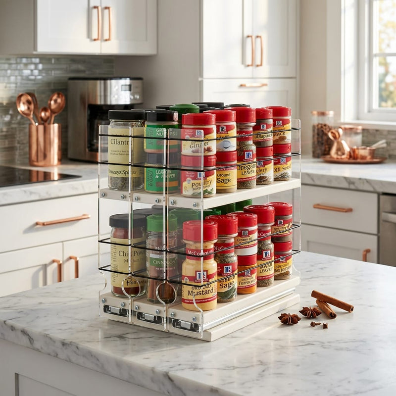 Our patented, American-made spice rack goes right into your existing cabinet - no tools, no drilling. See every spice. Reach every spice.