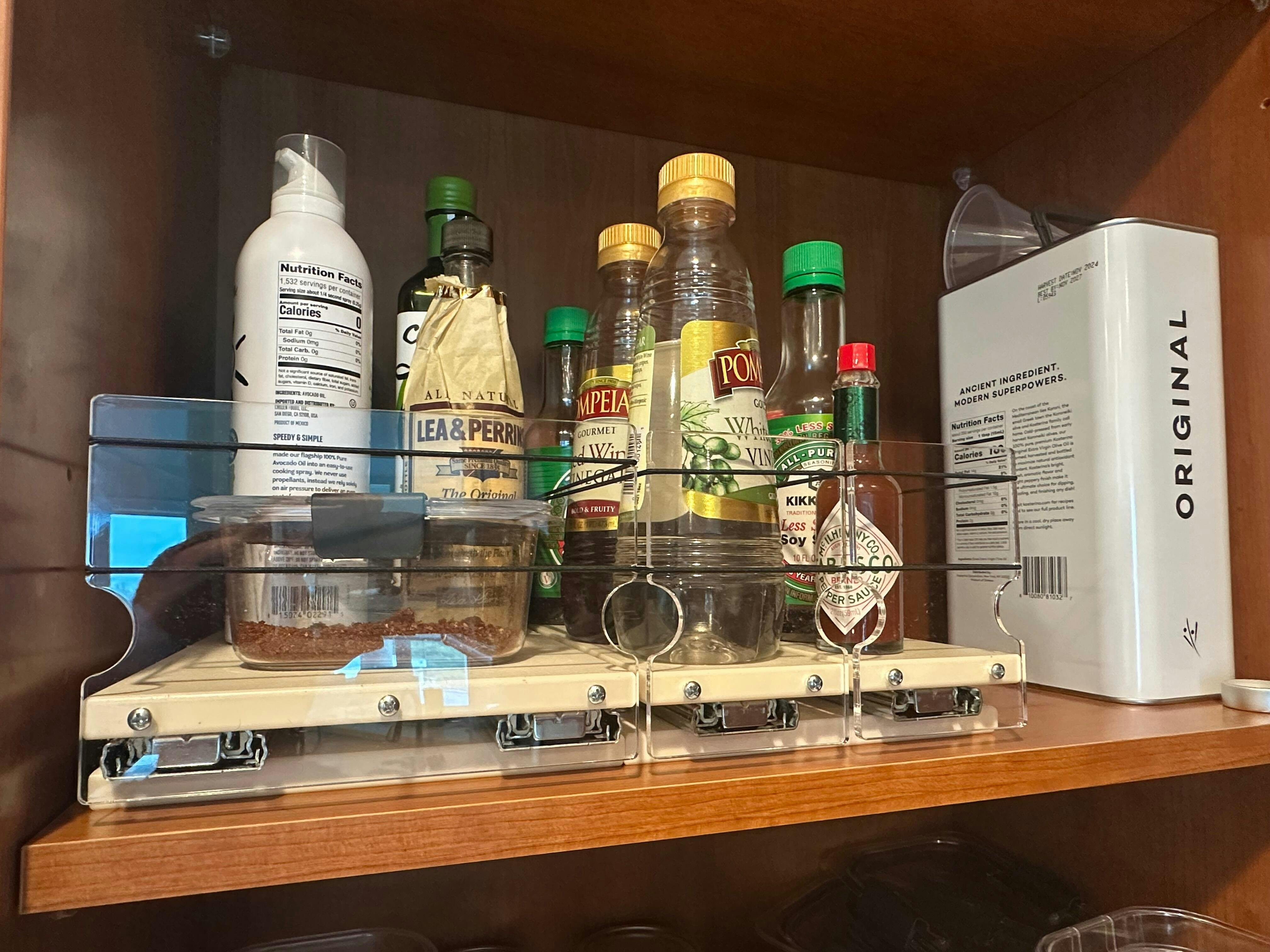 - Features: Ball bearing slides, visibility to containers, easy to access and organize, accommodates multiple sized containers, easy to mount in cupboard