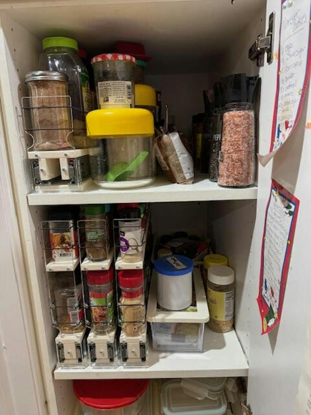 - Features: Ball bearing slides, visibility to containers, easy to access and organize, accommodates popular spice containers, no need to repackage spices, easy to mount in cupboard