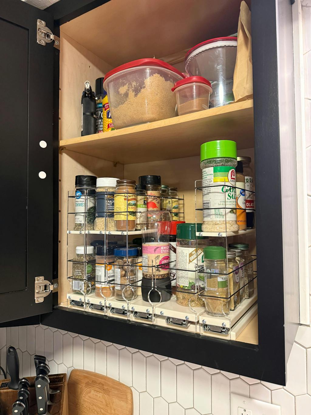 - Features: This is as skinny as it gets. Utilize this unit to get the most out of your unused space. Ball bearing slides, visibility to containers, easy to access and organize, accommodates popular spice containers, no need to repackage spices, easy to mount in cupboard