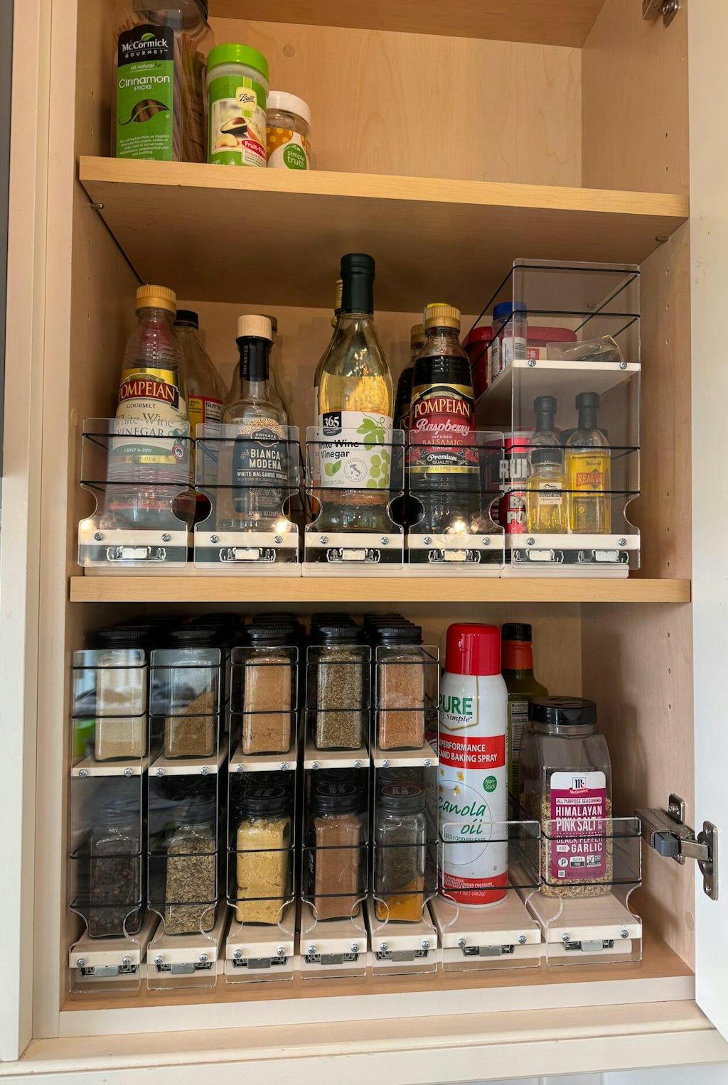 - Features: This is a versatile drawer, store your spices, vitamins and mid-sized containers double tall. A two-tier unit with extra space between the shelves when compared to the 2 x 2 and 2 x 1.5 units (5.5 " vs. 5.15"). Ball bearing slides, visibility to containers, easy to access and organize, easy to mount in cupboard